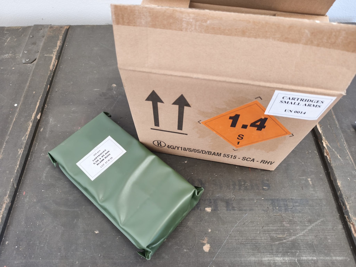 střelivo ráže 5,56x45mm blank M200, hermeticky balené v plastových sáčcích. Výroba Igman.