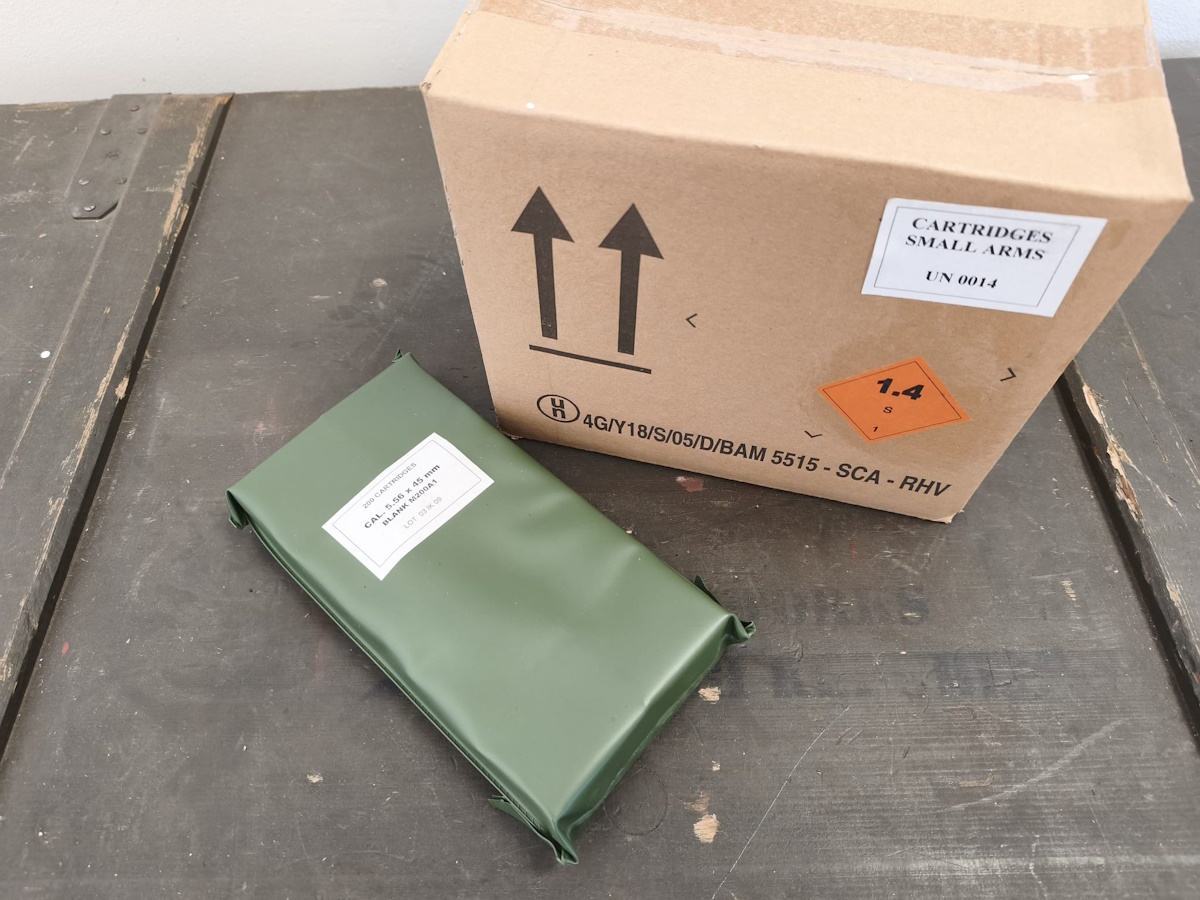 střelivo ráže 5,56x45mm blank M200A1, hermeticky balené v plastových sáčcích. Výroba Igman.